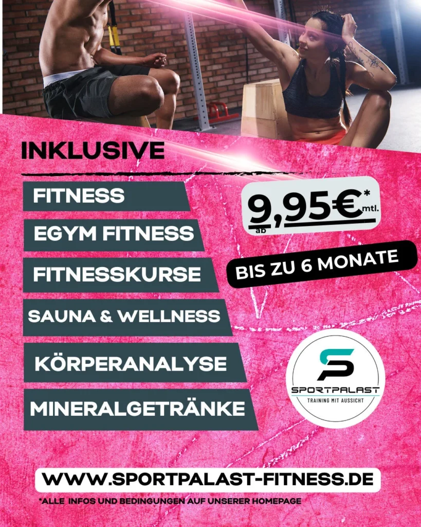 Mit unserer Neujahrsaktion trainierst du die ersten 6 Monate zum Mini-Preis – volle Leistung, kein Sparprogramm. Gerätetraining – Kurse – Sauna & Wellness – eGym Fitness – Körperanalyse – Trainingsbetreuung – Trainingsplanerstellung – Getränke